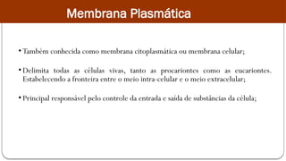 • Principal responsável pelo controle da entrada e saída de substâncias da célula;