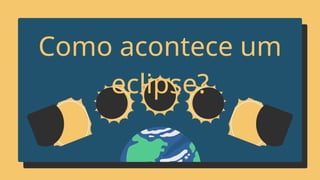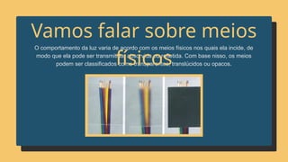 Apresentação sobre sombras, fontes de luz e eclipses para o estudo de óptica ideal para o segundo ano do ensino médio. Principio funda mental da óptica, Materiais opacos, materiais transparentes e materiais translúcidos, fontes de luz primária e secundária, formação de eclipse solar e eclipse lunar, eclipse anular, vídeo explicativo no final