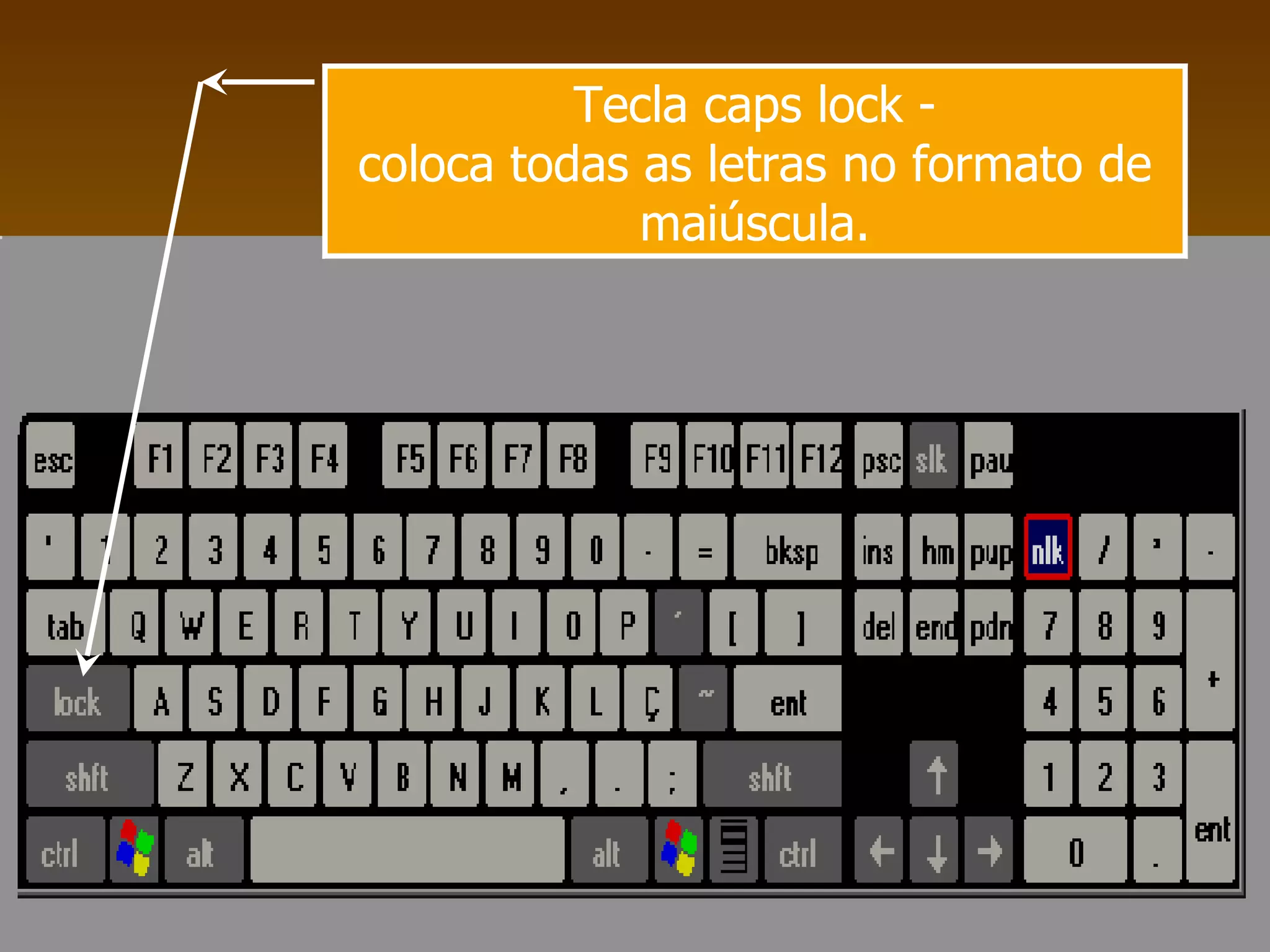 Este documento descreve as funções das principais teclas de um teclado de computador, incluindo teclas como Caps Lock, Shift, Ctrl, Alt, Enter, Tab, Backspace, Delete, Setas de navegação e teclas F1-F12. Explica como cada tecla é usada individualmente ou em combinação com outras teclas para executar comandos e funções específicas.