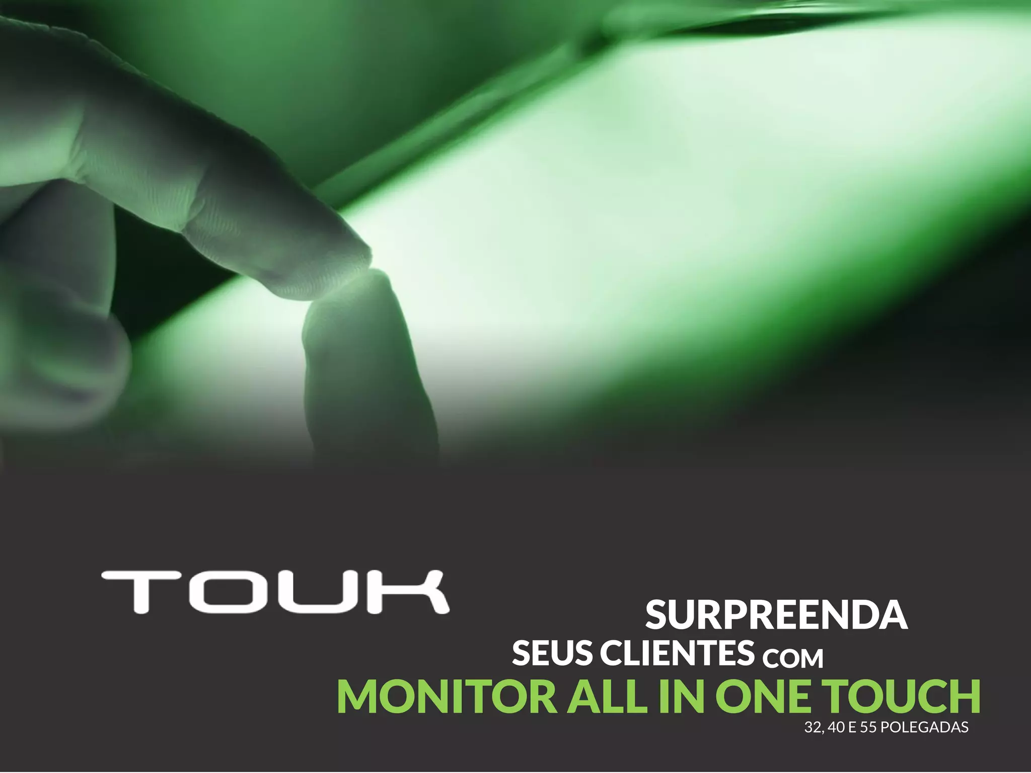 A TOUK fornece monitores touchscreen de 32, 40 e 55 polegadas para uso em diversos segmentos como corporativo e industrial. Os monitores são robustos, possuem múltiplos toques simultâneos e suportam aplicativos interativos como catálogos e jogos. A TOUK oferece soluções completas incluindo desenvolvimento de aplicativos, instalação, transporte e assistência técnica.