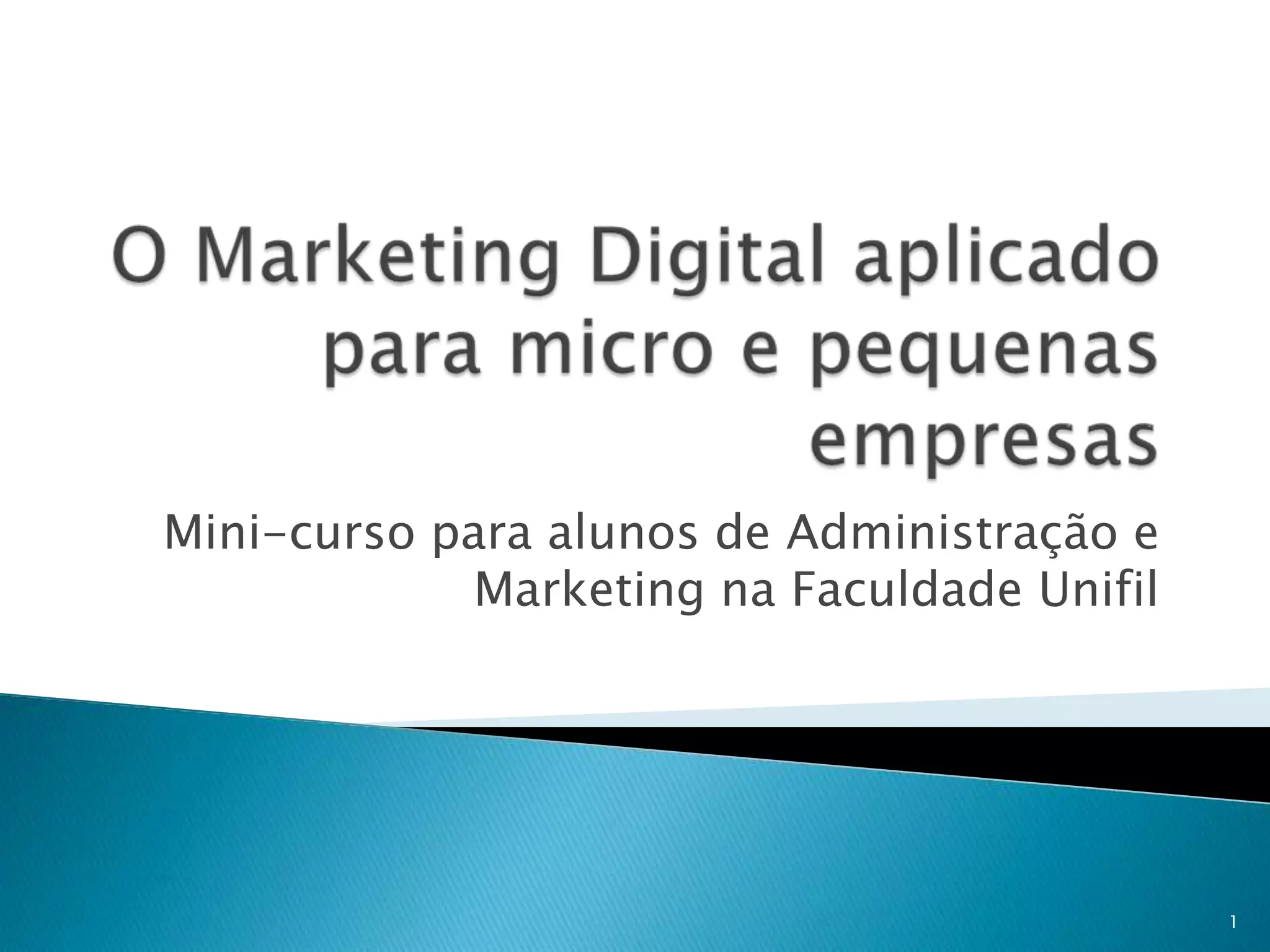 O documento apresenta um mini-curso sobre marketing digital para alunos de administração e marketing na Faculdade Unifil. O curso aborda tópicos como a revolução digital, o que é marketing digital, ferramentas digitais e estratégias para iniciar um negócio online e obter resultados.