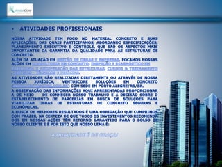 O documento lista as qualificações e experiências profissionais de um consultor de gestão de concretagem de estruturas, incluindo: 1) Formatação de cursos sobre o tema e consultoria para diversas empresas no Brasil; 2) Participação em projetos de grandes estruturas como chaminés, fábricas e lajes; 3) Realização de perícias e estudos de viabilidade de projetos.