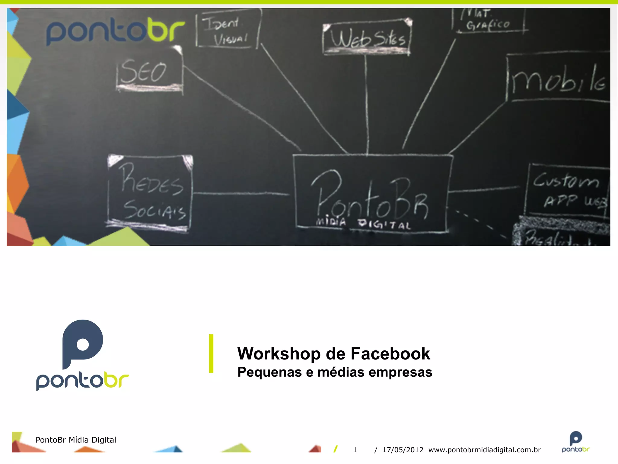O documento discute como pequenas e médias empresas podem usar o Facebook para fins de marketing. Ele explica os principais recursos do Facebook que podem ser usados, como páginas, grupos e anúncios. Além disso, fornece dicas sobre como criar uma página no Facebook, gerar conteúdo relevante e analisar os resultados das campanhas.