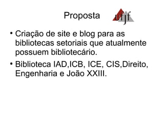 Este documento propõe a criação de sites e blogs para as bibliotecas setoriais da UFJF para divulgar seus serviços e produtos à comunidade acadêmica. O cronograma inclui a criação de e-mails institucionais para cada biblioteca em maio/2010, diretrizes em junho/2010, blogs e sites em setembro/2010 e divulgação em outubro/2010.