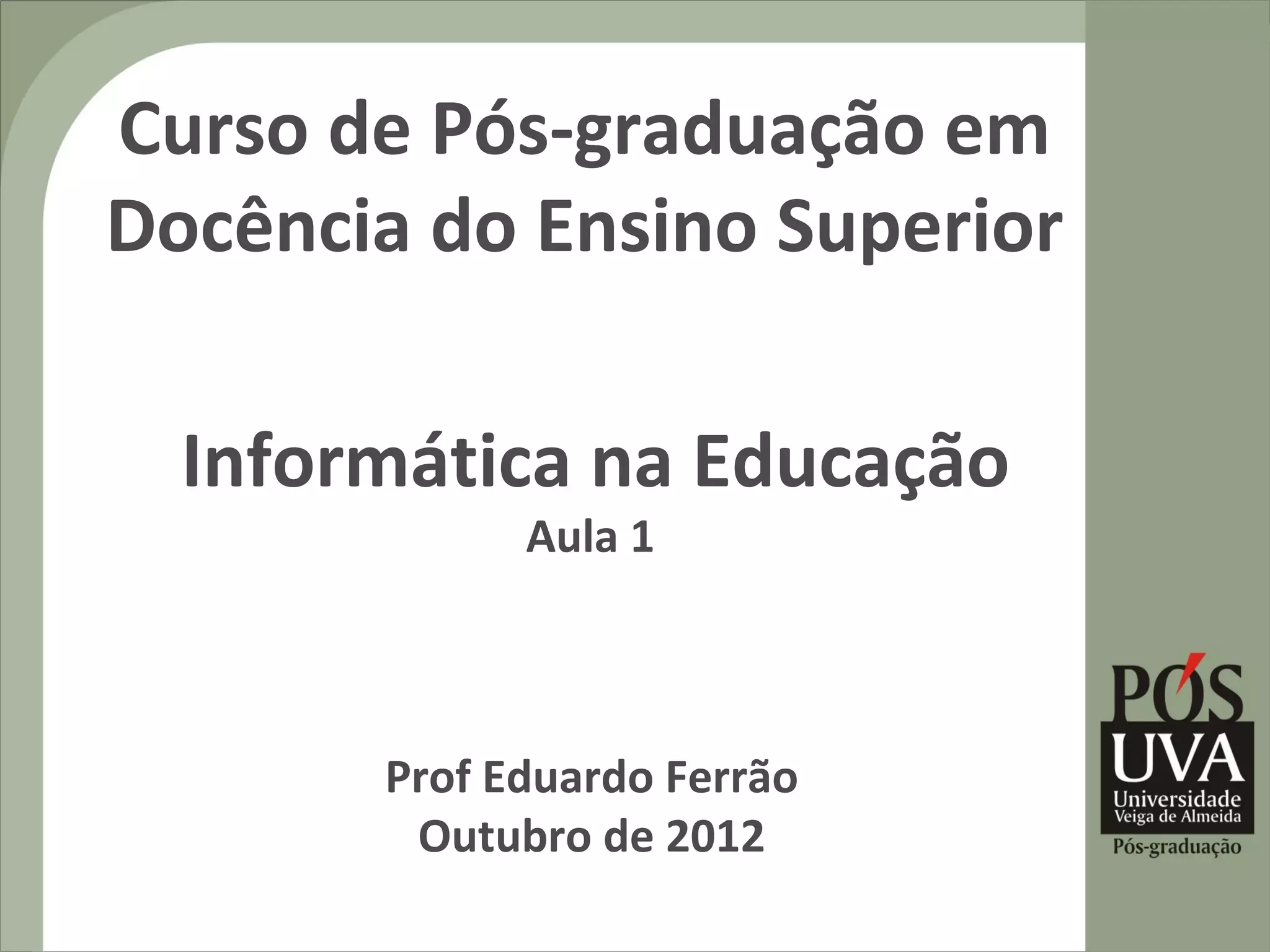 Este documento descreve a primeira aula de um curso de pós-graduação sobre informática na educação. A aula inclui uma apresentação do grupo, objetivos do curso e da disciplina, conteúdo programático, estratégias de ensino e critérios de avaliação.