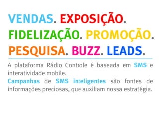 O Radio Controle é a plataforma de interatividade da Refinaria iltda. o RC Inteligencia é um servico de potencializacao de campanhas SMS para criacao de leads, exposicao de marca, buzz, geracao de leads e muito mais.