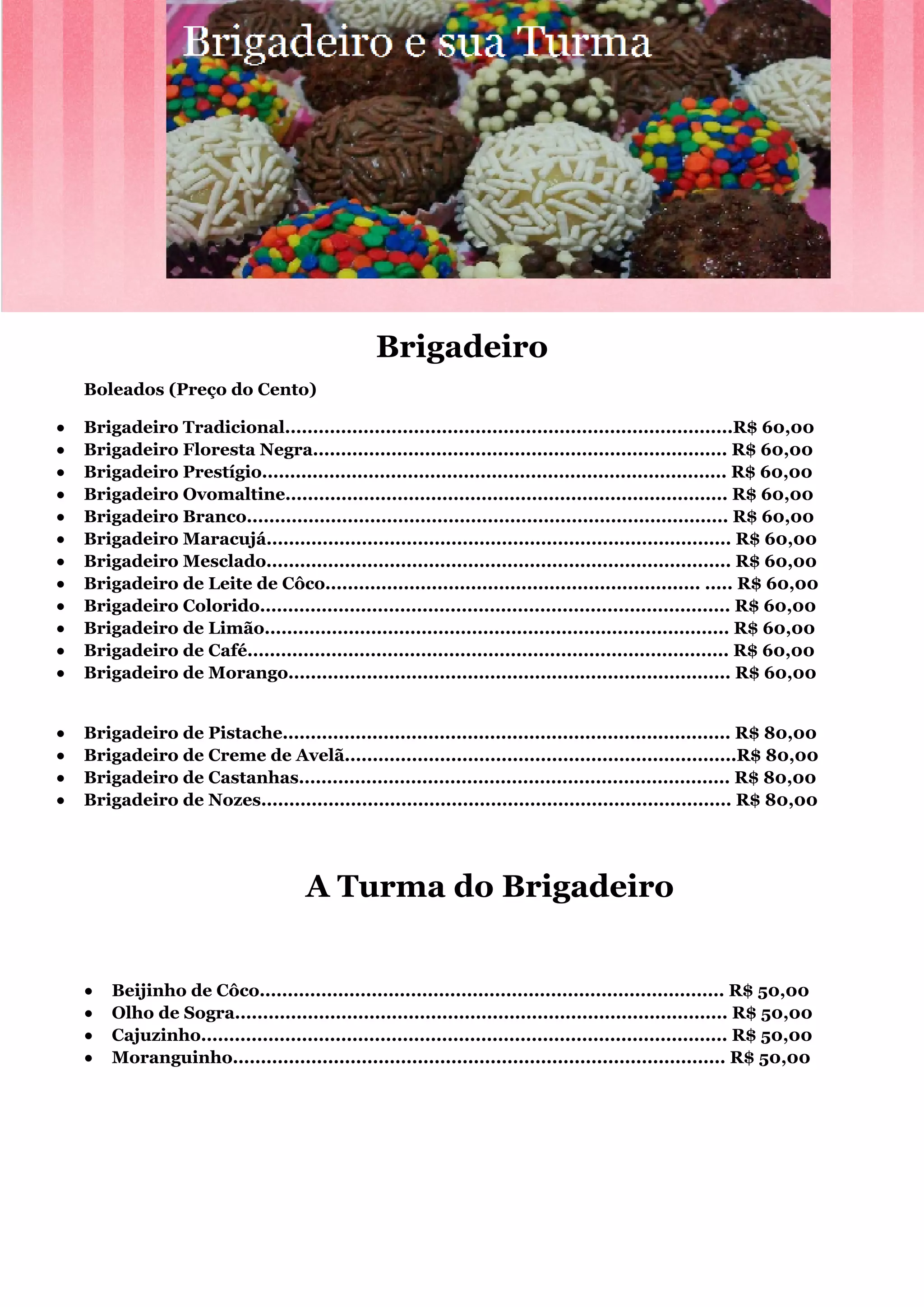 O documento lista os tipos e preços de brigadeiros e outros doces de uma confeitaria, incluindo brigadeiros tradicionais e de sabores especiais por R$60-80 o cento, combos de doces como beijinhos por R$50 o cento, opções de apresentação como caixas e tubinhos de brigadeiro de R$7-40, e formas de pagamento com 50% adiantado e o resto na entrega.