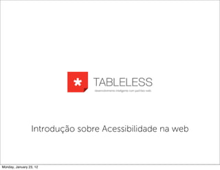 O documento discute a importância da acessibilidade na web, definindo-a como o consumo da informação por qualquer pessoa por qualquer meio de acesso. Explica que a web serve para compartilhar informação sob diversos formatos e que acessibilidade beneficia todos os usuários, não apenas pessoas com deficiência. Também aborda boas práticas de marcação, semântica, atributos e design responsivo para tornar conteúdo acessível a todos.