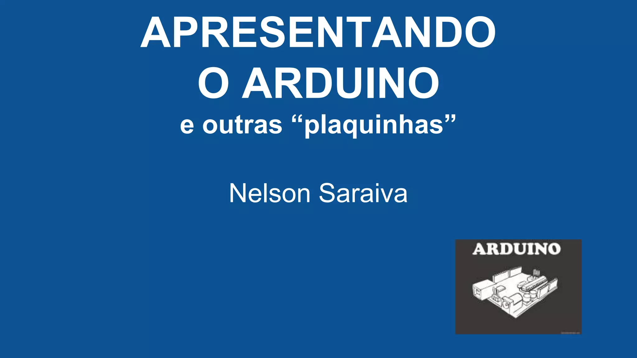 O documento apresenta o Arduino como uma plataforma de prototipagem eletrônica open hardware, criada em 2005 para facilitar a montagem de placas por estudantes. Discute também a utilização de shields, que são expansões que adicionam funções específicas ao Arduino, além de mencionar outras placas como Raspberry Pi e ESP8266. O autor fornece links para recursos adicionais e informações de contato.
