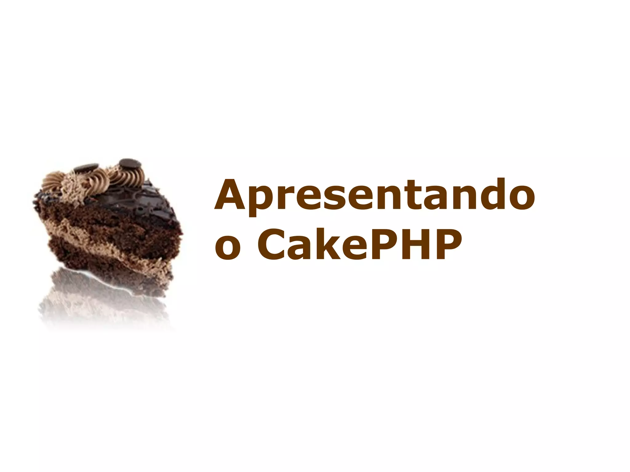 O documento apresenta o framework CakePHP, descrevendo-o como um framework rápido para desenvolvimento em PHP que fornece uma arquitetura extensível para desenvolver, manter e implantar aplicações. Também resume algumas das principais características e funcionalidades do CakePHP como ORM, geração de código e padrões de nomenclatura.