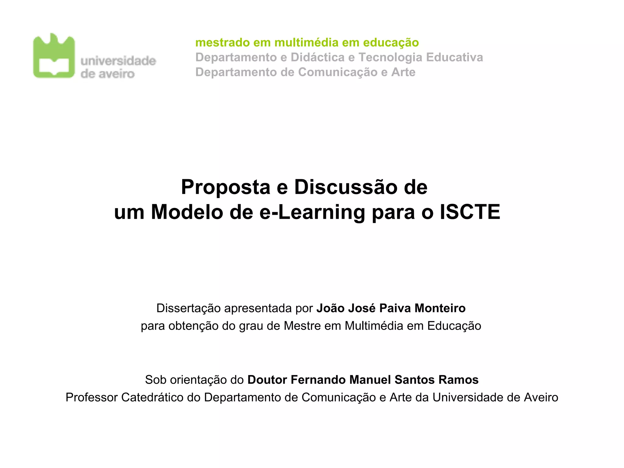 Este documento propõe um modelo de e-learning para o ISCTE com três componentes principais: institucional/organizacional, pedagógica e tecnológica. O modelo visa melhorar a qualidade do ensino no ISCTE através da introdução gradual de metodologias de ensino não presenciais em complemento às atividades presenciais, considerando as perspectivas dos alunos, docentes e instituição.