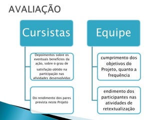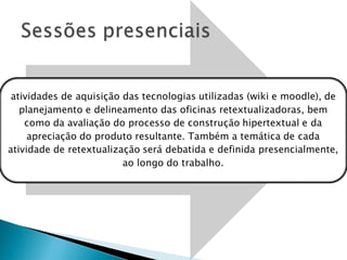 Este documento descreve um projeto de capacitação para professores sobre produção de hipertextos digitais. O projeto visa desenvolver habilidades com estratégias de retextualização do texto impresso para o hipertexto digital e ensinar as características e processos de produção de hipertextos.
