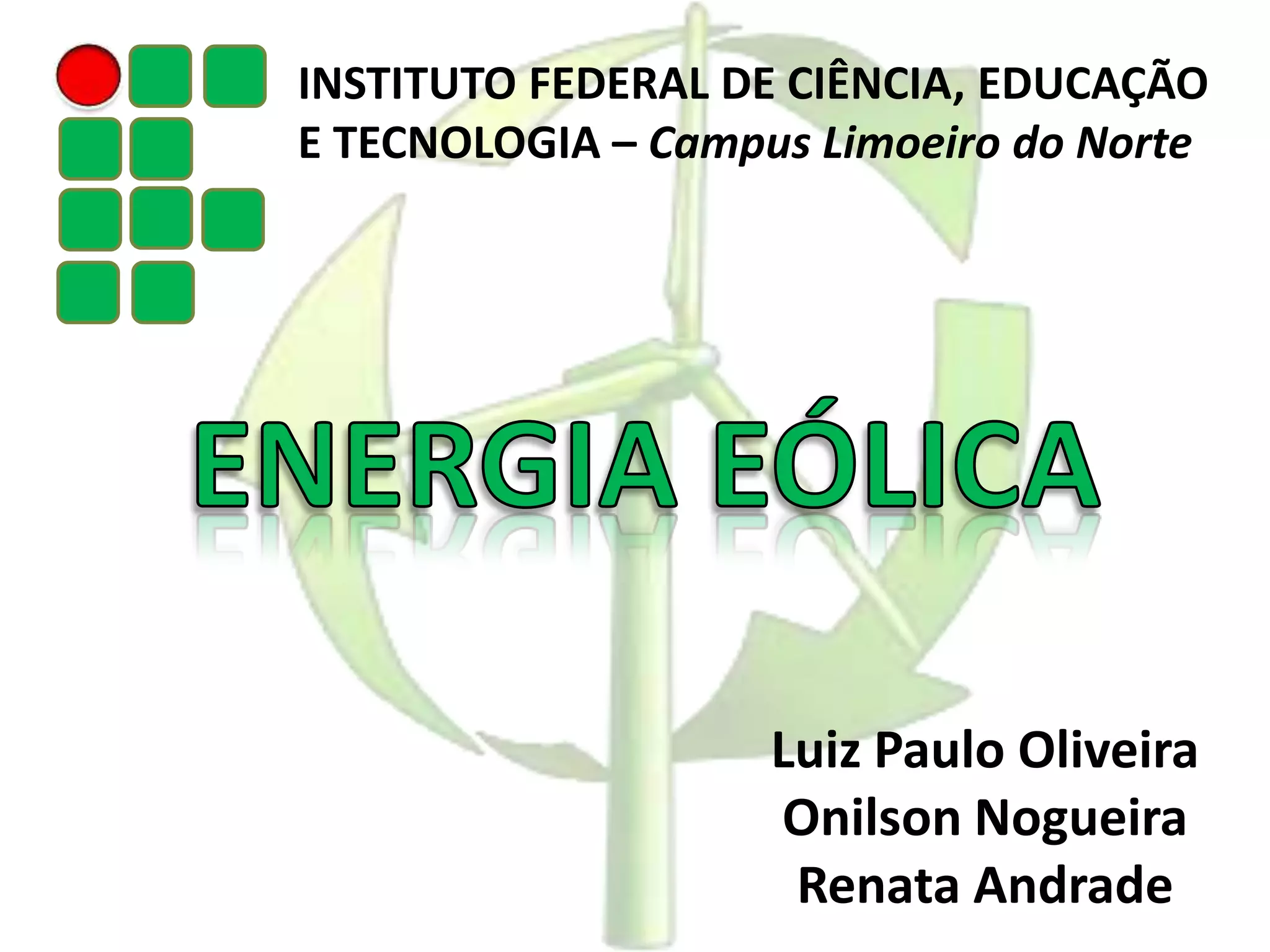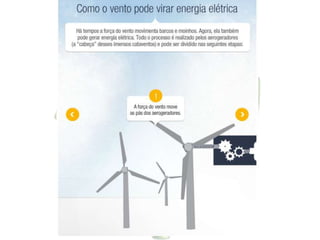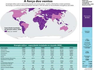 O documento discute a energia eólica, incluindo sua história, potencial no Brasil e fatores que afetam o projeto de parques eólicos, como a escolha do local, posicionamento das turbinas e como a potência é extraída do vento.