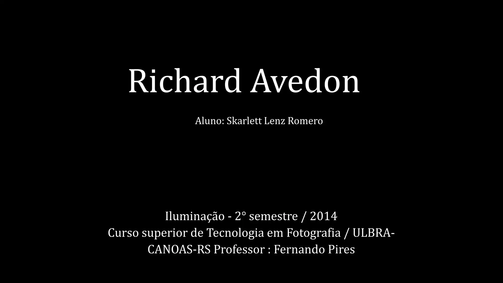 Richard Avedon foi um fotógrafo americano nascido em 1923 em Nova York. Ele começou a trabalhar com fotografia aos 12 anos e serviu na Marinha Mercante durante a Segunda Guerra Mundial. Após a guerra, Avedon estabeleceu seu estúdio em Nova York e trabalhou para revistas como Life e Vogue, onde se destacou por fotografar modelos fora do estúdio. Ao longo de sua carreira, Avedon fotografou diversos artistas, ativistas e vítimas de guerra.