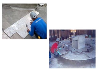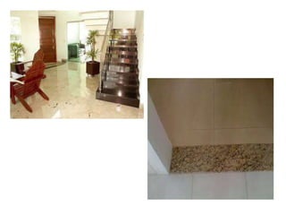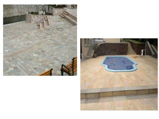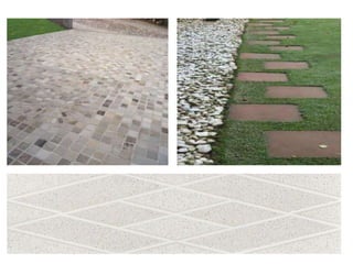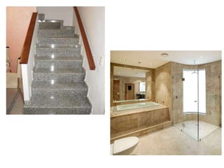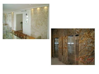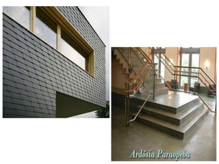 O documento fornece informações sobre diferentes tipos de pedras naturais e revestimentos, incluindo suas características, aplicações e métodos de instalação. Detalha pedras como granito, mármore, basalto, pedra são tomé e ardósia, além de falar sobre revestimentos com tijolos, mosaicos e lâminas de madeira.