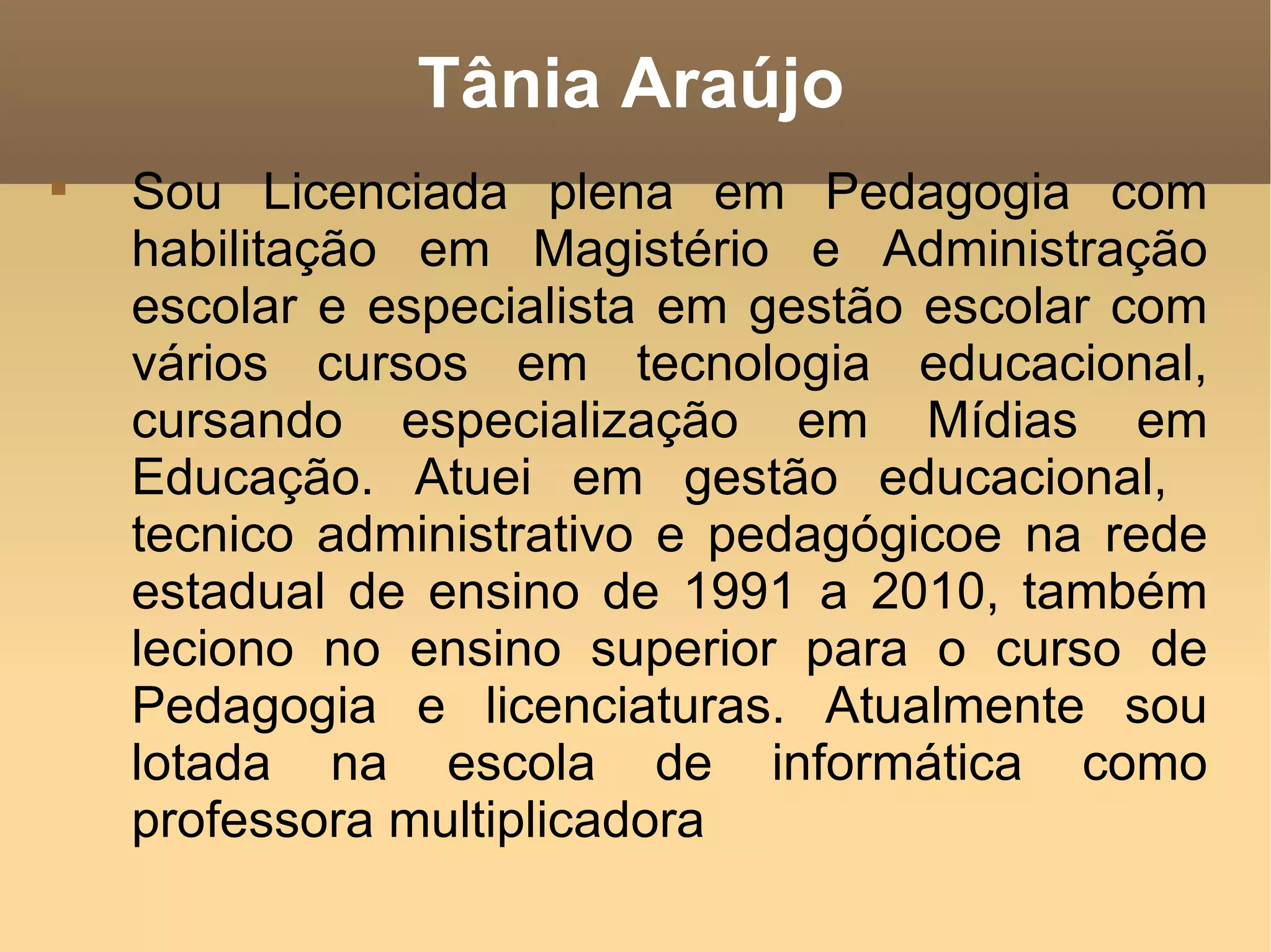 Tânia Araújo é uma licenciada em pedagogia com especialização em gestão escolar e administração, com experiência de 1991 a 2010 na rede estadual de ensino. Ela atualmente leciona no ensino superior e trabalha como professora multiplicadora de informática em uma escola.