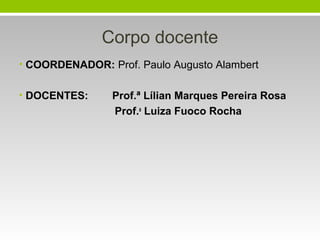 Este documento resume o programa da disciplina de Reumatologia para o 1o semestre de 2014 na Faculdade de Medicina da Fundação Lusíada. O curso será ministrado para a Turma B do 4o ano médico e incluirá atividades teóricas, teórico-práticas e práticas com foco em doenças reumáticas. O programa será conduzido pelos professores Paulo Augusto Alambert, Lílian Marques Pereira Rosa e Luiza Fuoco Rocha.