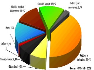As principais fontes de energia do Brasil são petróleo, hidroeletricidade, lenha e carvão vegetal, apesar de serem poluentes ou causarem grandes impactos ambientais. O Brasil busca fontes alternativas como álcool, energia eólica e solar, porém essas fontes ainda precisam ser desenvolvidas e ampliadas.