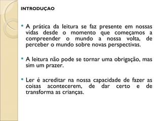 O documento discute estratégias para incentivar o hábito da leitura entre alunos, como visitas à biblioteca, contação de histórias e músicas. O objetivo é fazer com que a leitura seja prazerosa e significativa para as crianças e ajude no seu desenvolvimento.