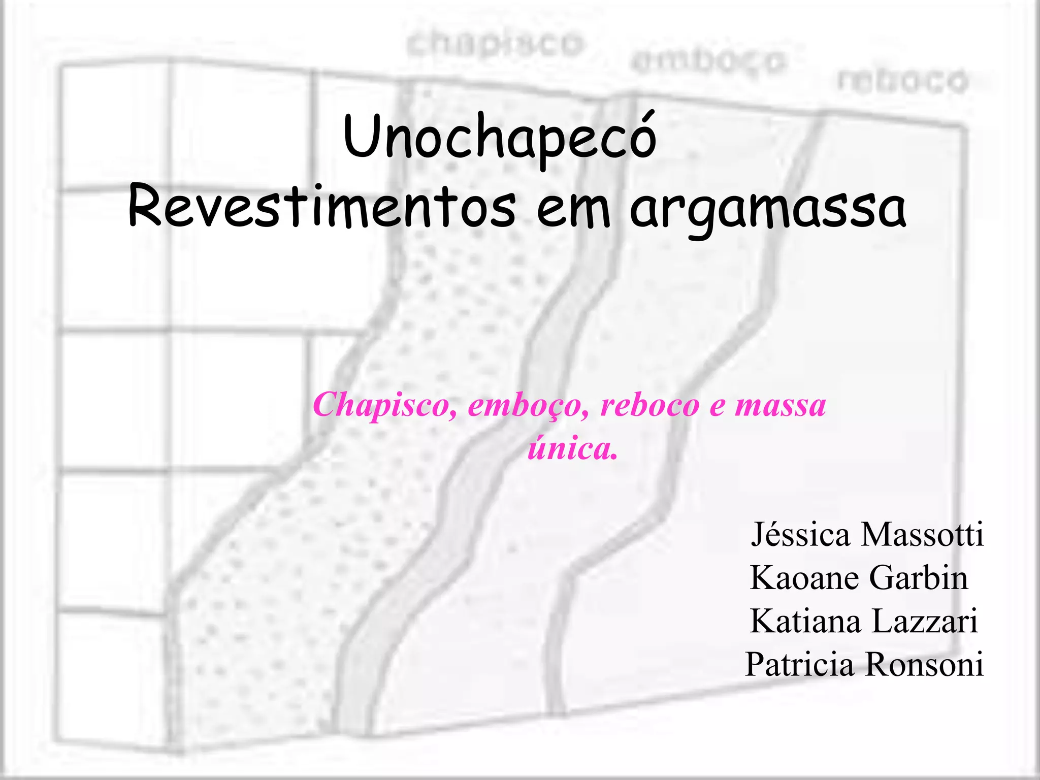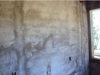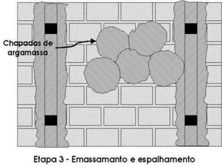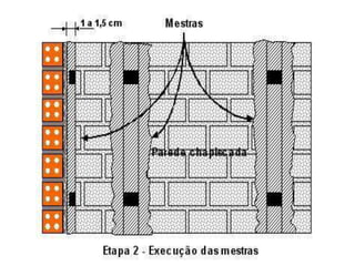 O documento fornece informações sobre diferentes tipos de revestimentos em argamassa, incluindo chapisco, emboço e reboco. Descreve os materiais, funções, aplicação e cuidados necessários para cada etapa do processo de revestimento.
