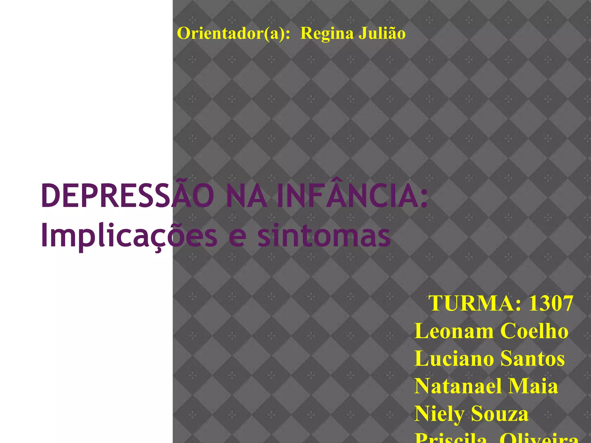 A depressão na infância pode causar problemas de comportamento e emoções nas crianças, como tristeza, irritabilidade e perda de interesse em atividades. Os sintomas incluem alterações de sono, apetite, energia e autoestima. O documento discute as implicações e sintomas da depressão infantil com base em uma referência bibliográfica.
