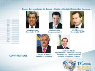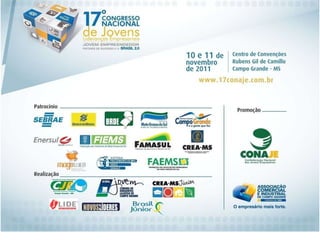 O documento detalha a programação do evento da CONAJE, que ocorre de 9 a 13 de novembro de 2011 em Campo Grande/MS, com foco em empreendedorismo e oportunidades de investimento. Além de reuniões e painéis sobre fatores de sucesso, a estrutura inclui prazos para credenciamento e informações sobre hospedagem para conselheiros. O público-alvo abrange cerca de 2.500 participantes, incluindo acadêmicos, empresários e autoridades diversas.