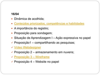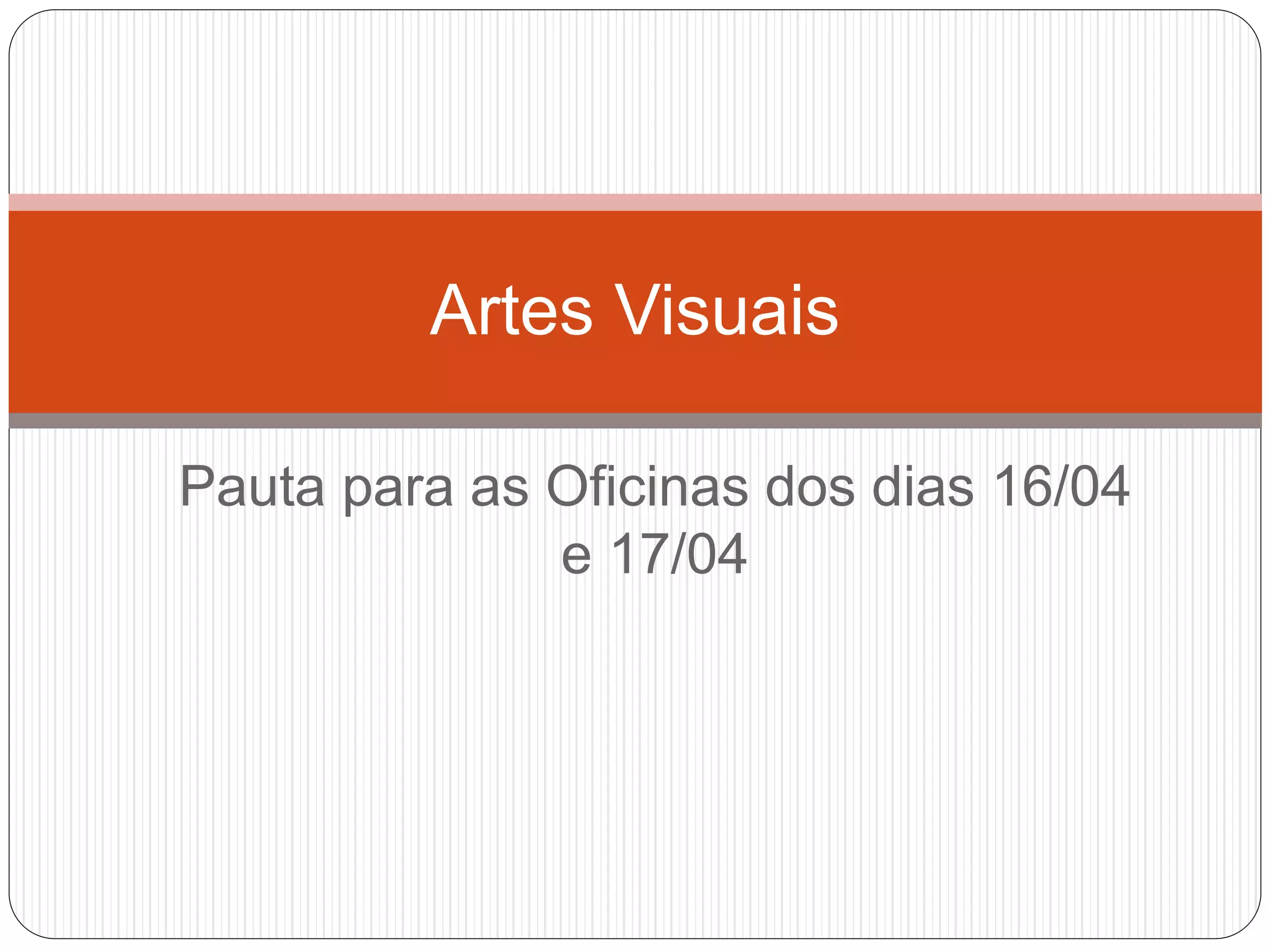 O documento apresenta a pauta para oficinas de artes visuais nos dias 16 e 17 de abril. A pauta inclui dinâmicas de acolhida, apresentação de conteúdos, situações de aprendizagem sobre ação expressiva no papel e virtual, e avaliação do processo.