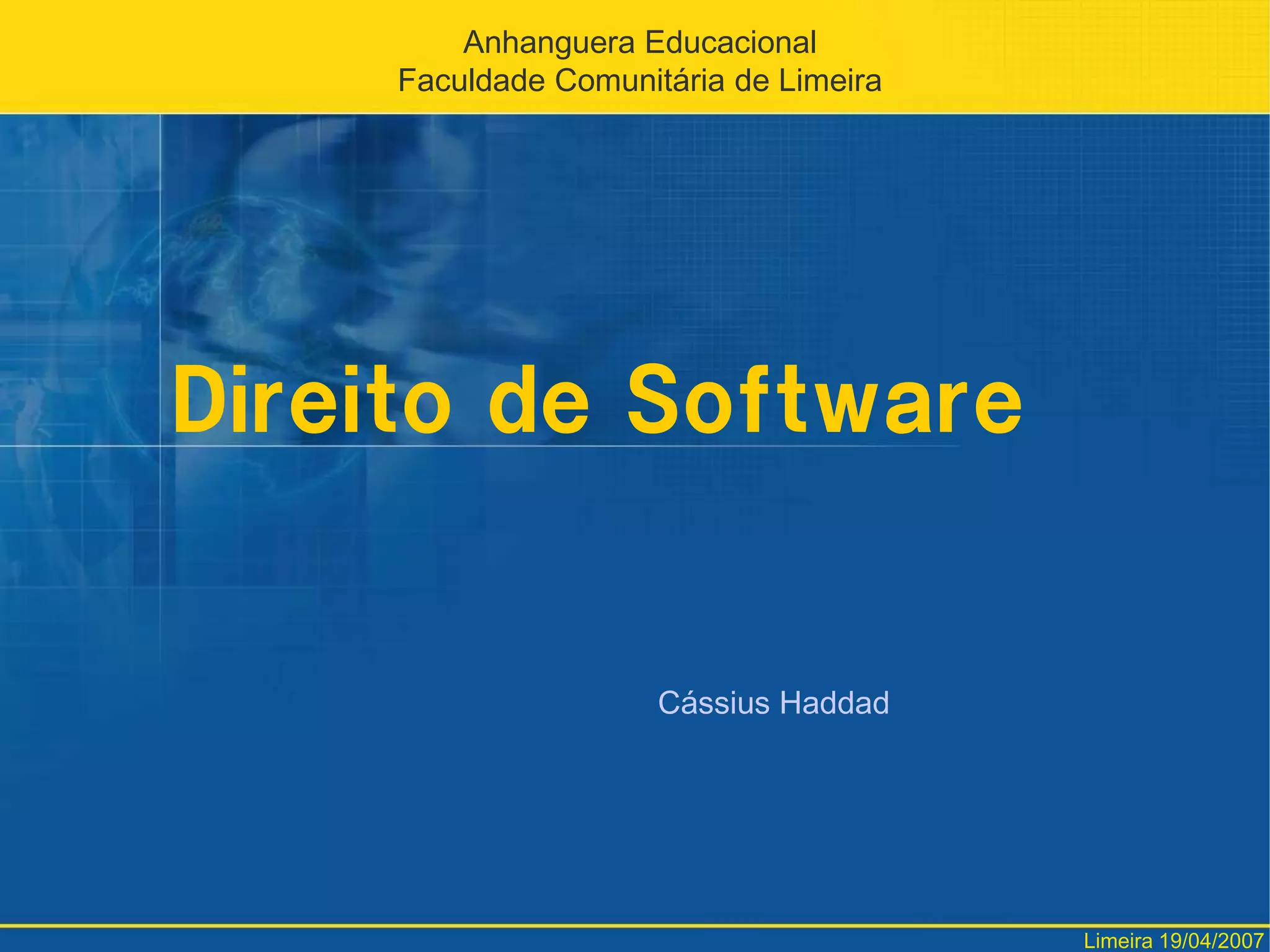 O documento discute vários aspectos do direito de software, incluindo a evolução histórica dos direitos autorais, proteção de programas de computador sob direitos autorais ou patentes, transferência e licenciamento de direitos autorais sobre software, e infrações e penalidades relacionadas à violação desses direitos.