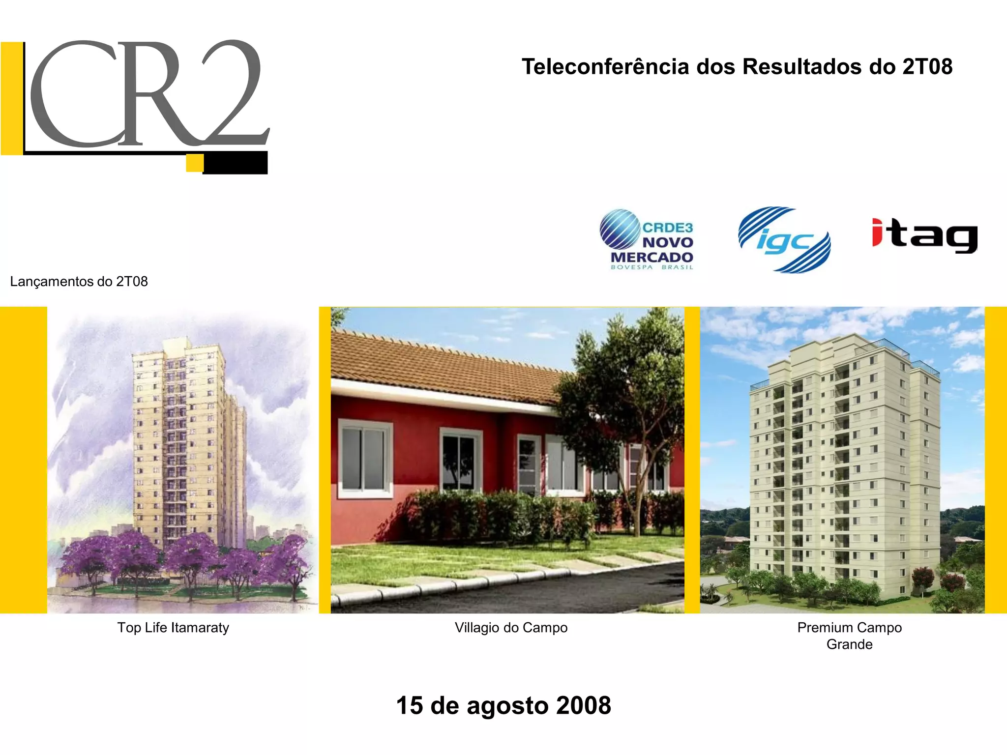 Este documento resume os resultados da CR2 no segundo trimestre de 2008. Teve lançamentos de R$217,6 milhões com 2.309 unidades, focando no segmento econômico. As vendas contratadas totalizaram R$221,2 milhões com velocidade de vendas de 72,3%. A receita líquida aumentou 662% em relação ao mesmo período do ano anterior e o lucro líquido aumentou 507%.