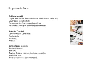 O curso abordará os conceitos fundamentais da contabilidade, como objetivo, usuários e demonstrações financeiras obrigatórias, além de técnicas como escrituração, custos, análise de balanços e contabilidade gerencial. Será ministrado no período de 27/04 a 18/05, com carga horária de 16h aos sábados das 13h às 17h pelo instrutor David Silva.
