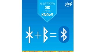 O documento descreve a tecnologia Bluetooth, incluindo sua história desde 1998, especificações, hardware, espectro, conexão entre dispositivos, alcance e interferência. Bluetooth permite a comunicação sem fio de voz, dados e outros arquivos entre dispositivos em uma rede pessoal de curto alcance.