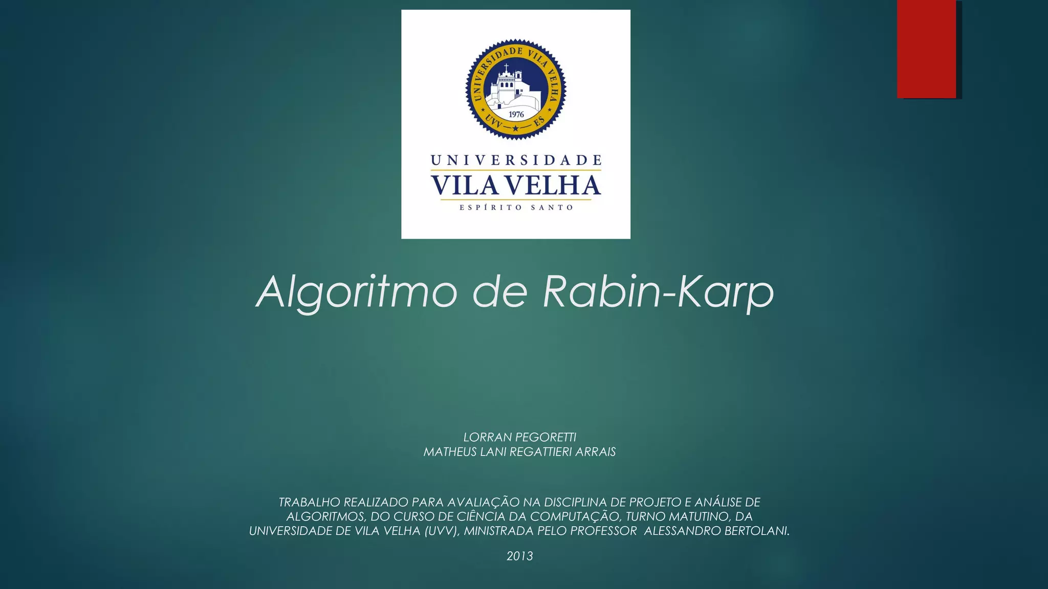 O documento descreve o algoritmo de Rabin-Karp para busca de padrões em strings. O algoritmo usa hashing para representar substrings do texto e a string padrão como valores numéricos, e compara esses valores em vez de comparar os caracteres diretamente. Isso reduz o número de comparações necessárias em média e no melhor caso para O(m+n). O documento também apresenta exemplos e compara o desempenho de Rabin-Karp com outros algoritmos de busca de padrão.