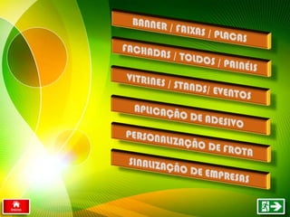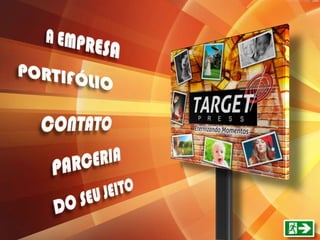 A empresa Target Press oferece serviços de impressão, comunicação visual e personalização, com mais de 10 anos de experiência. Eles se destacam pela qualidade, agilidade, preços competitivos e transparência. A empresa tem como valores a inovação, confiabilidade e qualidade, e oferece uma variedade de serviços como banners, placas, painéis, totens e personalização de veículos.