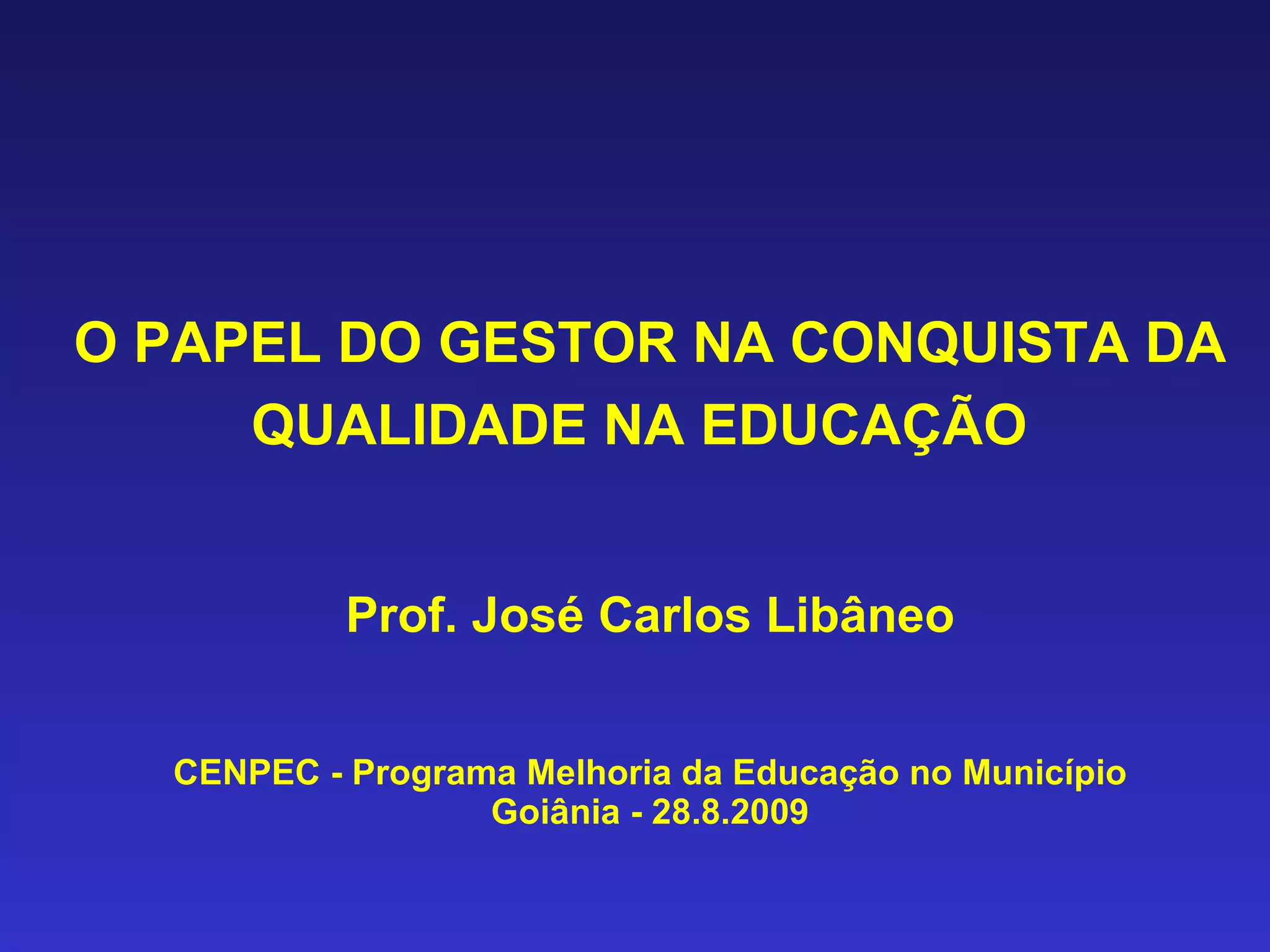 O documento discute o papel do gestor na conquista da qualidade na educação. Ele aborda: 1) A razão de ser da organização e gestão das escolas para promover a aprendizagem dos alunos; 2) O tipo de escola necessária para um mundo em mudança, que ensine valores e competências para a vida; 3) Como a organização e gestão das escolas, incluindo suas práticas e cultura organizacional, influenciam positivamente a aprendizagem.