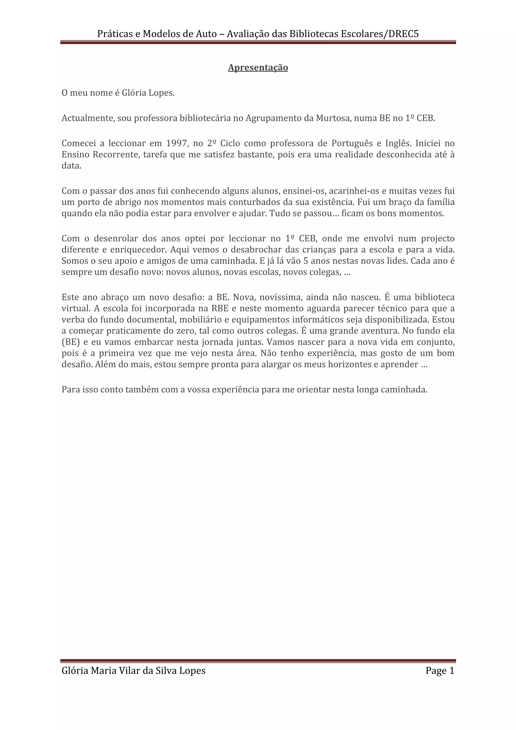 Glória Lopes apresenta-se como professora bibliotecária numa escola primária. Ela ensinou português e inglês por muitos anos antes de se tornar professora bibliotecária. Agora ela está começando um novo desafio de criar uma biblioteca virtual na escola desde o início.
