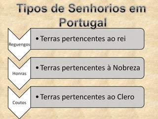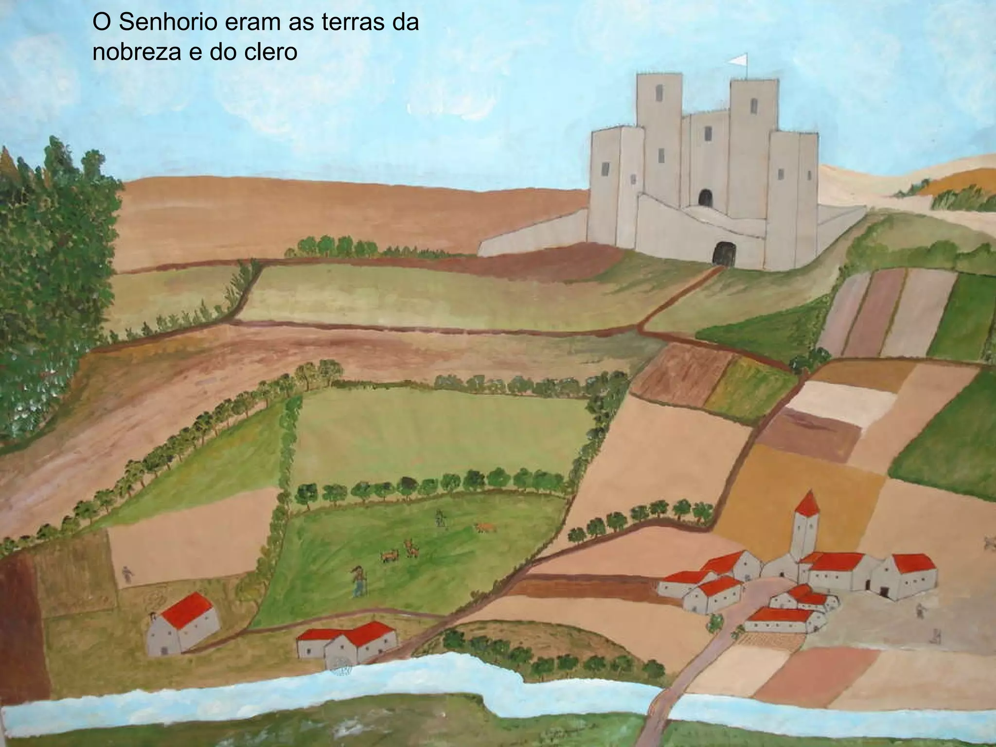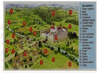 1) O senhorio era uma unidade de produção feudal formada por terras e autoridade sobre os habitantes concedida pelo rei a um senhor.