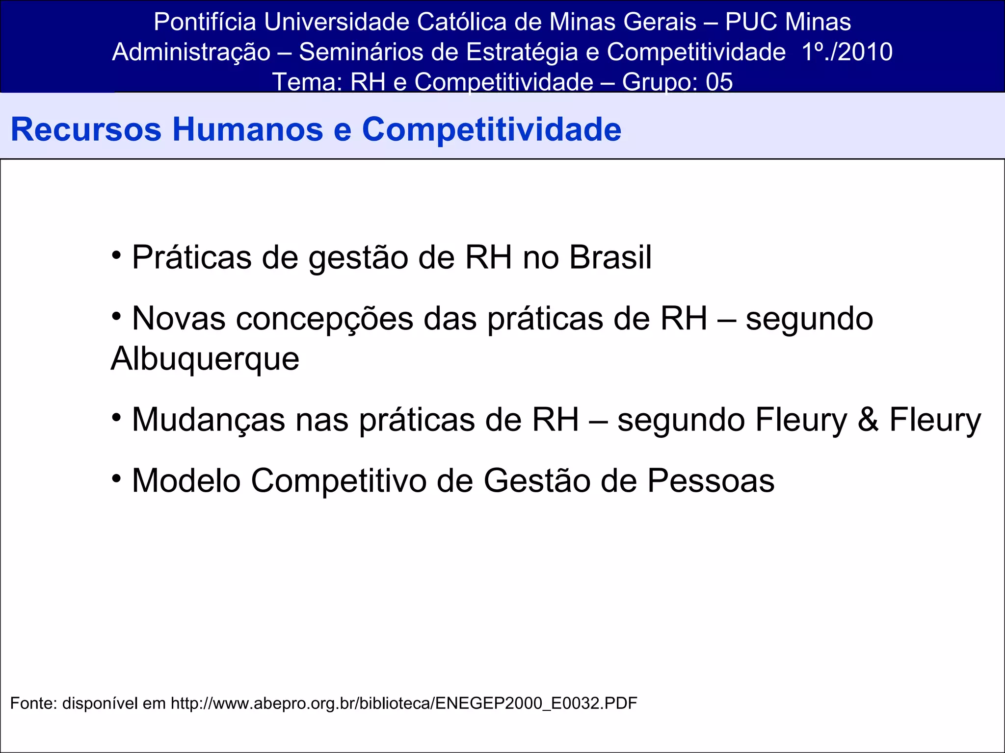 O documento discute as práticas de gestão de recursos humanos no Brasil ao longo do tempo, identificando diferentes abordagens como pré-jurídico-trabalhista, burocrática, tecnicista e sistêmica. Também apresenta novos conceitos de gestão de pessoas segundo Albuquerque e Fleury & Fleury, enfatizando a importância da qualificação, remuneração por desempenho e transformação do papel do empregado de colaborador para parceiro.