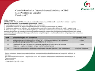 A empresa Conmarfel pretende instalar uma fábrica no município de Horizonte, Ceará para produzir janelas, portas e painéis termoacústicos com tecnologia desenvolvida na Europa para melhorar o isolamento térmico e acústico de construções. A empresa solicita incentivos fiscais do estado como redução de ICMS e diferimento sobre insumos para o novo empreendimento industrial.