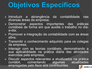 O documento descreve os objetivos e atividades do departamento de controladoria, incluindo introduzir a contabilidade para diferentes áreas da empresa, integrar a contabilidade com outras áreas, e discutir aspectos relevantes da prática contábil. Ele também fornece detalhes sobre relatórios e conceitos contábeis como balanço patrimonial, demonstrações contábeis, ativo, passivo, imobilizado, entre outros.