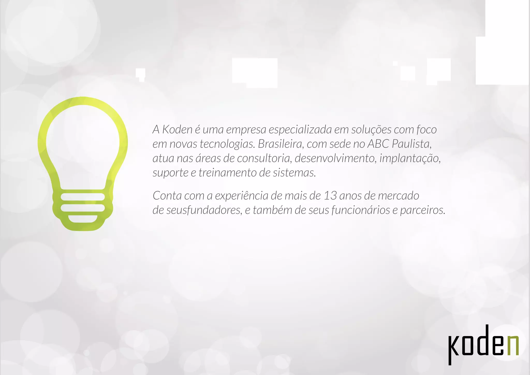 A Koden é uma empresa brasileira de soluções tecnológicas, especializada em consultoria, desenvolvimento e treinamento de sistemas, com mais de 13 anos de experiência. Sua missão é oferecer soluções com excelência utilizando modernas tecnologias, enquanto seus valores incluem transparência e valorização das pessoas. A empresa também desenvolve cursos interativos em parceria com diversas organizações, utilizando frameworks próprios compatíveis com múltiplas plataformas.