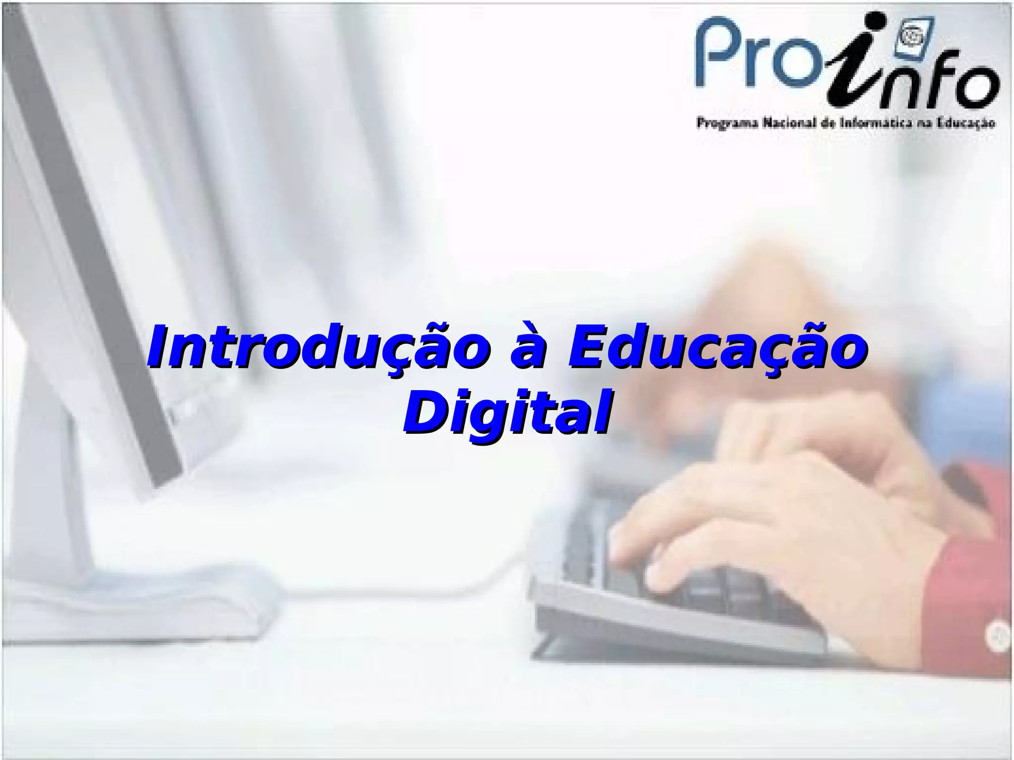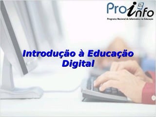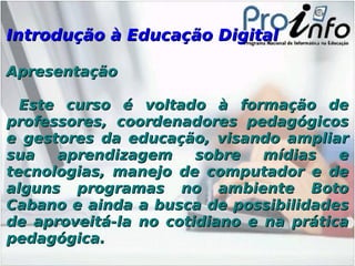 Este curso introdutório à educação digital apresenta nove unidades sobre tecnologias digitais e sua aplicação na educação. As unidades cobrem tópicos como inclusão digital, pesquisa na internet, comunicação online, edição de texto, apresentações, blogs, e planilhas eletrônicas. O curso é destinado a professores, coordenadores e gestores e visa ampliar seu conhecimento sobre mídias digitais e como aplicá-las na prática pedagógica.