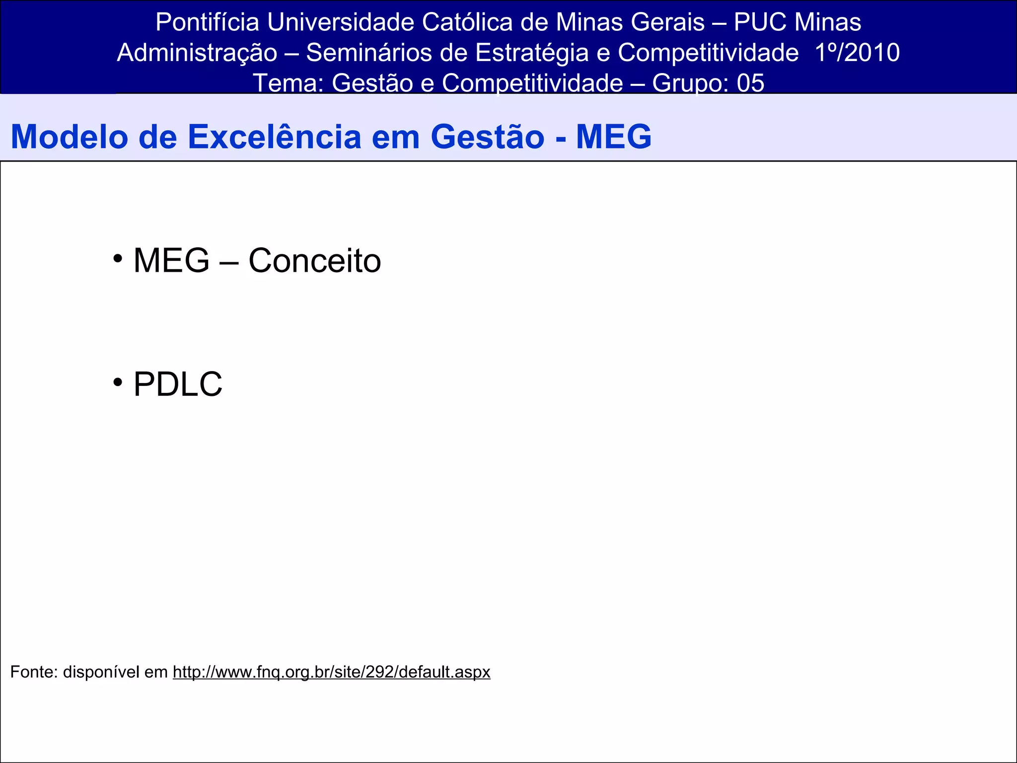 O documento discute o Modelo de Excelência em Gestão (MEG) e seus fundamentos. O MEG é baseado no pensamento sistêmico, aprendizado organizacional, cultura de inovação e liderança constante com foco em processos, informações, visão de futuro, geração de valor, pessoas, clientes, parcerias e responsabilidade social.