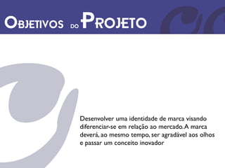 O documento apresenta o manual de identidade visual de uma marca. Ele descreve o desenvolvimento do nome, logotipo e cores da marca visando diferenciá-la no mercado de forma inovadora e agradável. O manual também especifica as aplicações e usos corretos da identidade visual desenvolvida.
