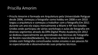 Priscilla Amorim é uma fotógrafa formada em Arquitetura que largou sua carreira inicial para se dedicar à fotografia. Ela viajou frequentemente aos Estados Unidos para participar de workshops e aulas, especializando-se em fotografia de recém-nascidos através de cursos no Brasil e exterior. Priscilla Amorim desenvolveu suas próprias técnicas na área.