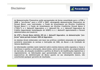 O documento apresenta as demonstrações financeiras consolidadas do Paraná Banco para o 4T08 e 2008, incluindo suas controladas e fundos de investimento. Destaca o lucro líquido de R$84,1 milhões em 2008, com crescimento de receitas e ativos totais, além da diversificação de produtos e canais de distribuição.