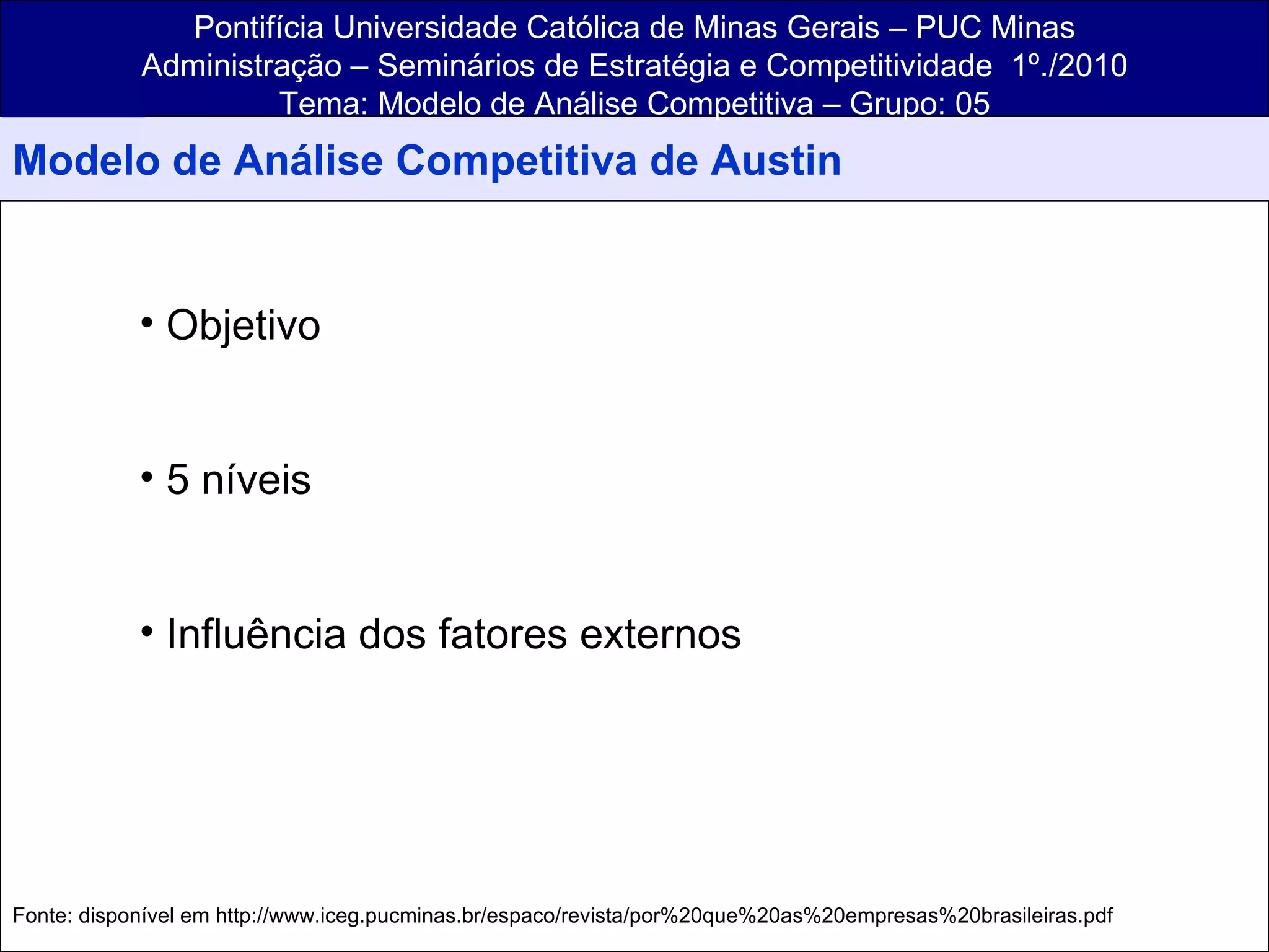 Pontifícia Universidade Católicade Minas Gerais – PUC Minas Administração – Seminários de Estratégia e Competitividade 1º./2010 Tema: Modelo de Análise Competitiva – Grupo: 05 Objetivo 5 níveis Influência dos fatores externos Fonte: disponível em http://www.iceg.pucminas.br/espaco/revista/por%20que%20as%20empresas%20brasileiras.pdf Modelo de Análise Competitiva de Austin