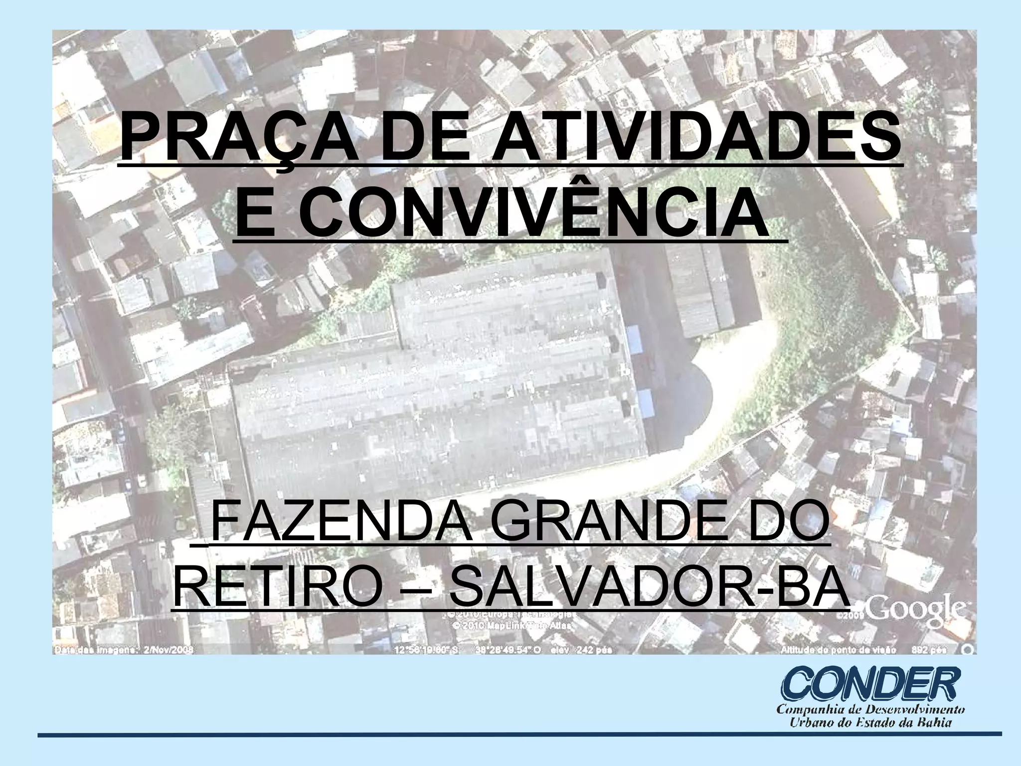 O documento descreve a distribuição de equipamentos culturais, esportivos e de lazer em uma praça de atividades e convivência na Fazenda Grande do Retiro em Salvador. A praça contará com um parque infantil, pista de caminhada, pista para bicicleta, módulo de administração, infocentro, casa de capoeira, capacitação profissional, convivência para a terceira idade, anfiteatro, ginásio coberto, equipamentos para atividade física, pista de skate e sanitários públicos