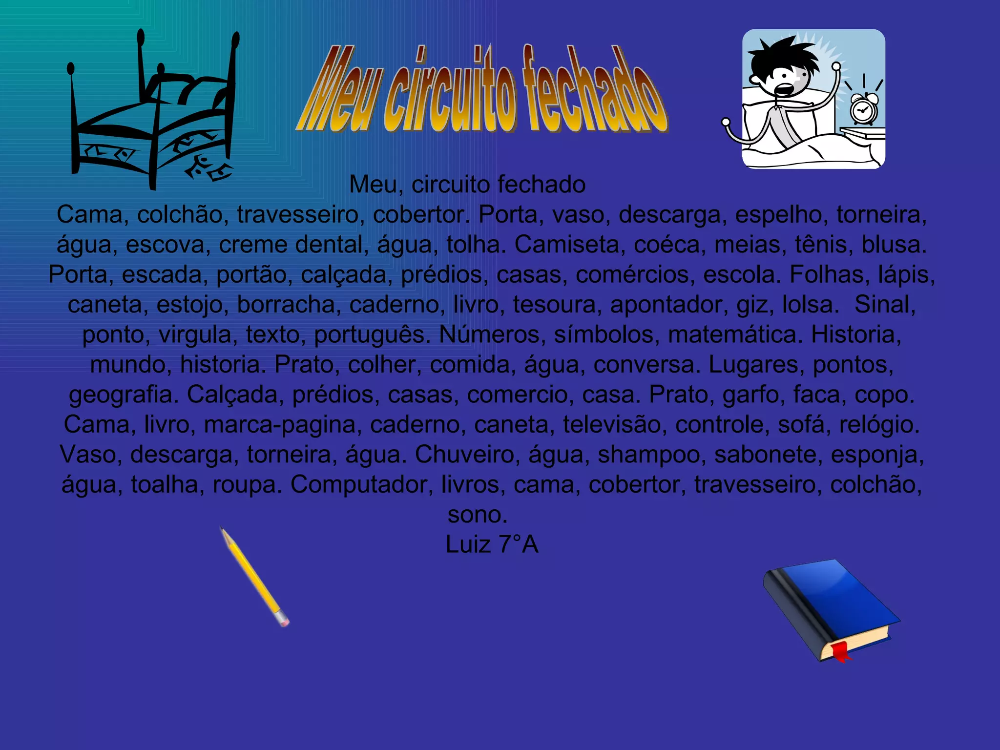 O documento descreve as rotinas diárias de uma pessoa, incluindo atividades como acordar, se arrumar, ir para a escola, fazer as tarefas escolares, comer, assistir TV, dormir. Também menciona itens como roupas, material escolar, móveis e eletrodomésticos.