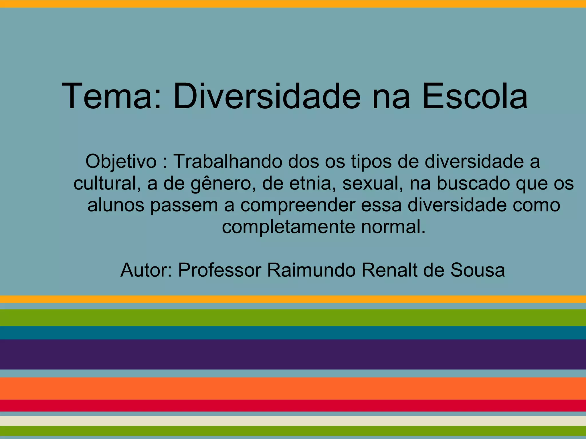 O documento propõe trabalhar a diversidade cultural, de gênero, étnica e sexual na escola para que os alunos compreendam essas diferenças como normais. O autor defende que a escola deve valorizar cada indivíduo e ensinar a importância da diversidade, promovendo uma convivência harmônica e desenvolvendo nos alunos capacidades para atuação democrática e solidária na sociedade.