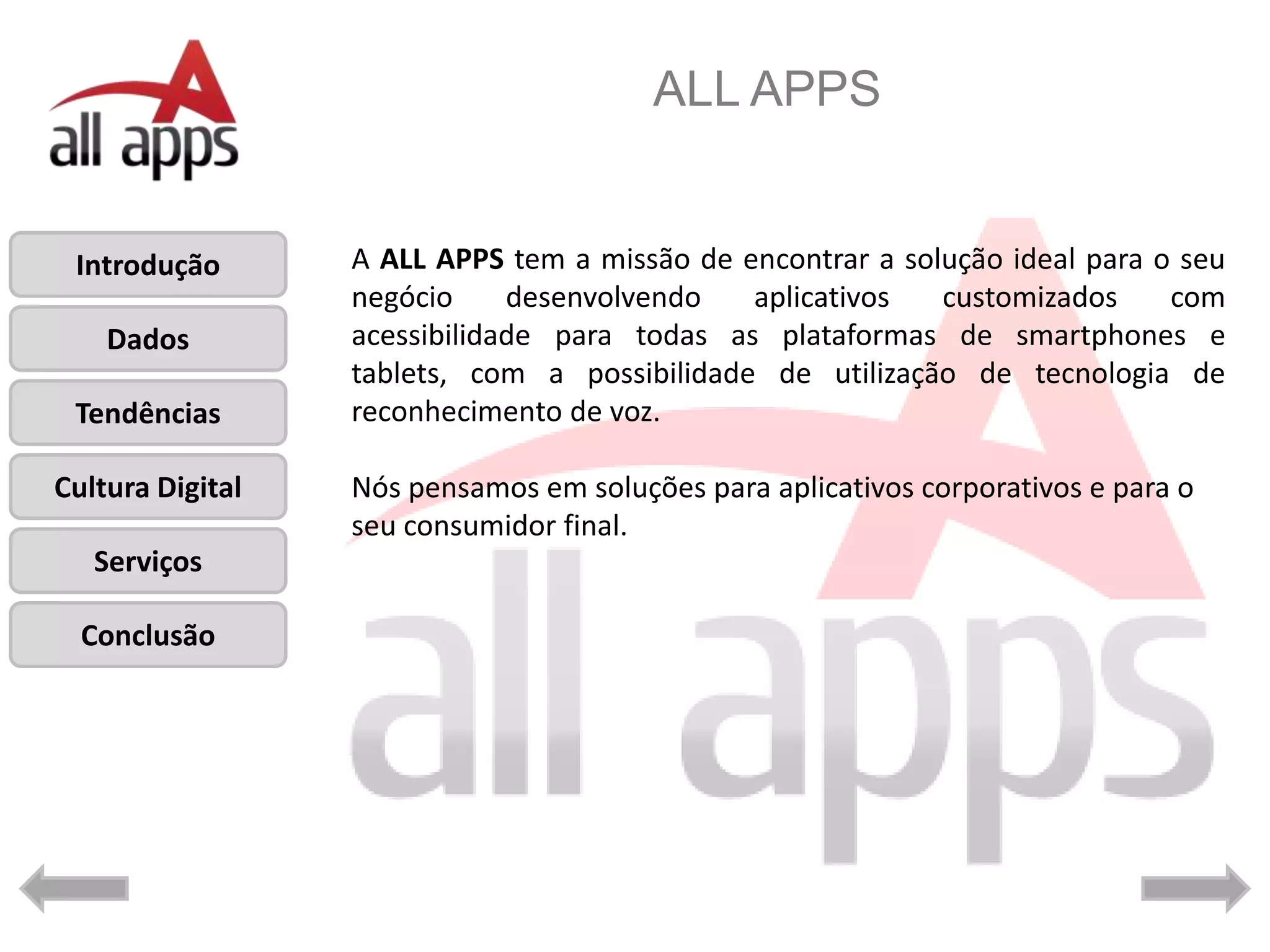 O documento discute as tendências do mercado de aplicativos móveis, incluindo o rápido crescimento do uso de smartphones e a demanda por aplicativos que forneçam conveniência e valor agregado aos usuários. A empresa ALL APPS oferece serviços de desenvolvimento de aplicativos customizados para diferentes plataformas, incluindo a possibilidade de reconhecimento de voz.